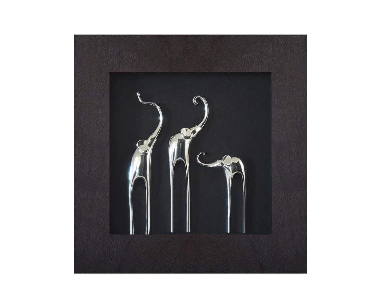 Three whimsical elephants play in the Samnaum I Elephant Graphic. The contrasting metal on a black shadow box creates a glorious three-dimensional effect and adds sophisticated charm to your room. Hang this artwork on its own or create a harmonious collection with the coordinating elephant graphic.