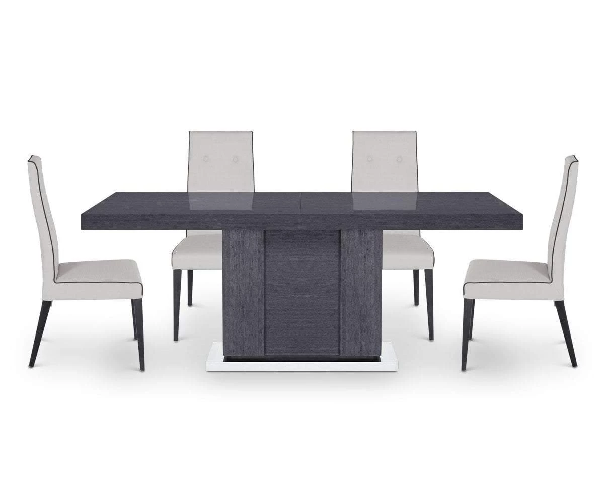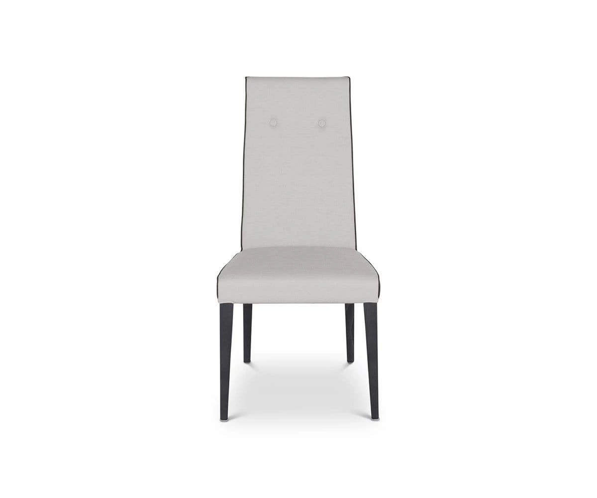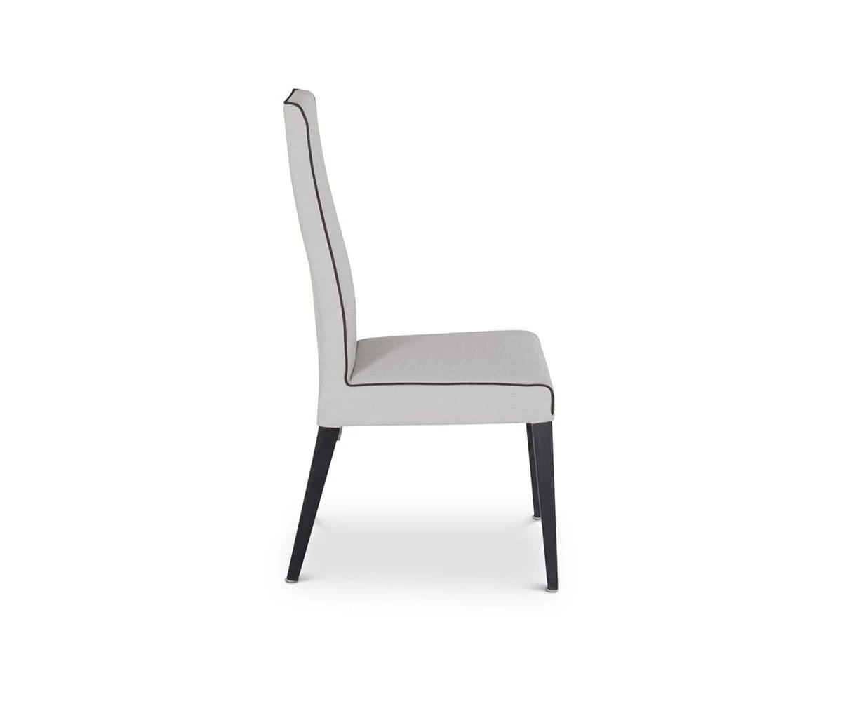 The Mondiana Dining Chair is upholstered in a light grey fabric with a contrasting welt that coordinates with the elegant legs constructed of grey koto veneer with a high gloss finish.