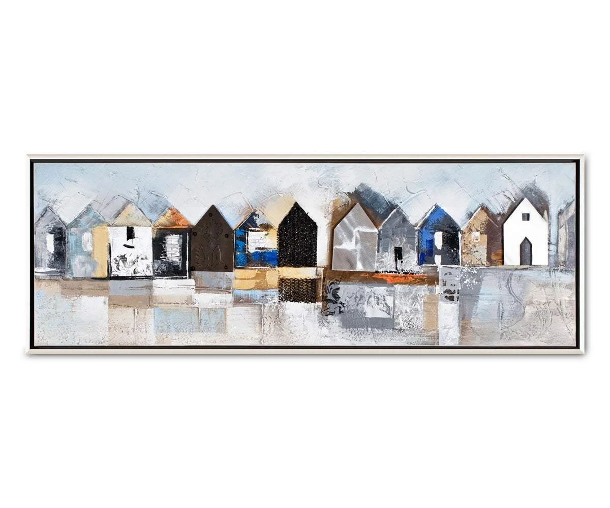 A charming landscape breezes across the large scale Fishing Village Oil Painting. This mixed media piece is a brilliant fit over a sofa or sectional.