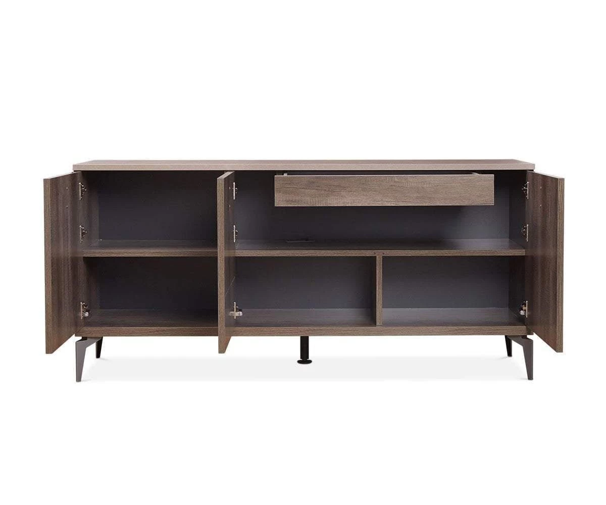 Made in Italy, the Akana Sideboard brings a wealth of storage to your dining room. A sense of natural warmth comes from the striking wood grain pattern enhanced by the high gloss finish and intriguing metal accents. Three doors open to reveal five spacious compartments and a single drawer. Organize your table decor, glassware, serving dishes and more in a stylish statement piece for your dining area.
