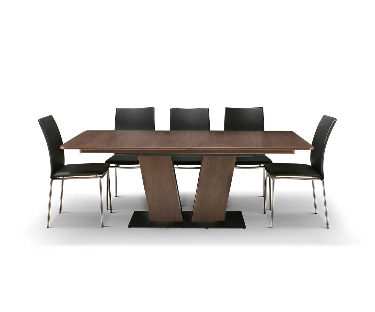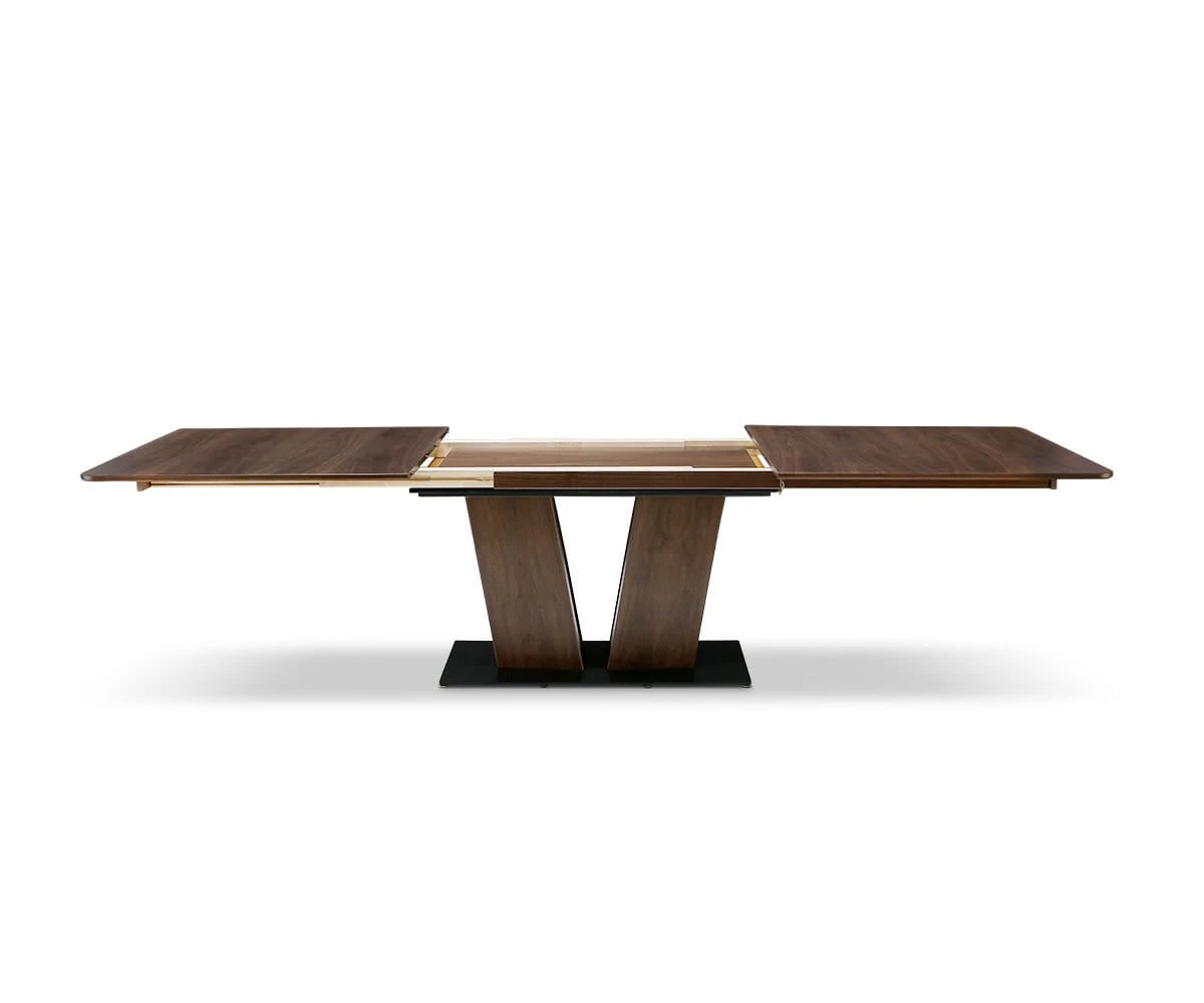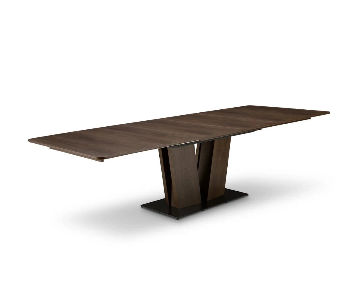 Celebrate the art of dining with the Thisted Extension Dining Table. The sculptural V-shaped base introduces a dynamic presence to your dining space, while the durable black metal foot plate blends stability with style. Two self-storing leaves are neatly hidden away, ready for guests when you are.