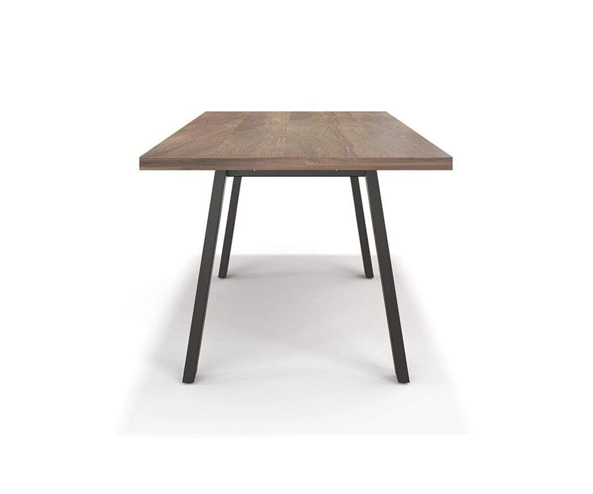 The Arren Dining Table showcases classic rustic industrial style. A wood-patterned melamine table top makes this piece remarkably easy to clean. The sturdy, angled legs of this table are strikingly juxtaposed with the surface of this piece, and stand out with their black metal powder-coated finish. Place this modern table in your dining room for a clean look, or use it as a conference table in your office space and enjoy the infusion of modern, streamlined design. Made from 100% recycled materials, this piece was deliberately produced with zero environmental impact.