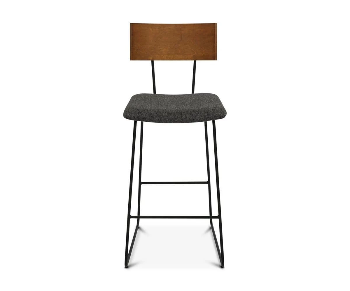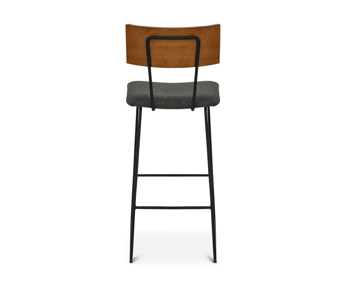 The Karsten Bar Stool offers a rustic industrial look, exuding modern style and fine craftsmanship. The sleek black metal frame is complemented with a curved wood backrest and printed cushion seat. A footrest bar ensures leg comfort.